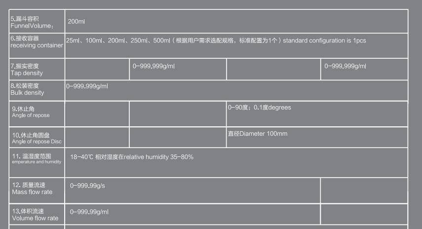 提供中文或英文語言版本選擇,,自動測量控制系統(tǒng),分析粉末和顆粒物料,采用光電測量系統(tǒng)自動測量數(shù)據(jù),數(shù)據(jù)由集成電路系統(tǒng)處理并分析評定物料的流動性狀態(tài),反映粉體和顆粒的流動能力和密度數(shù)據(jù)為料倉設(shè)計(jì)。