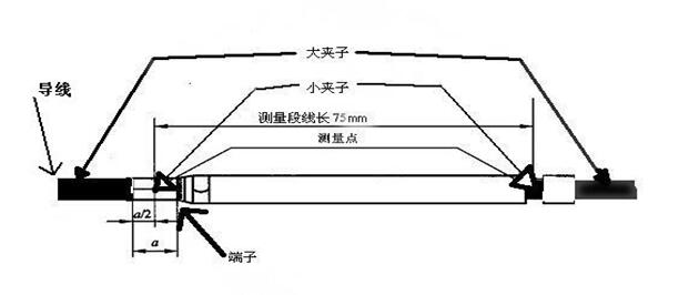 如上示兩圖中,圖1導線首端帶有端子,測量75mm長帶端子導線的兩端壓降,記錄數據備用;圖2中導線不帶端子,直接測量75mm長導線的兩端壓降,記錄數據;用圖1中測得的壓降減去圖2中測得的壓降即為被測端子的壓降。